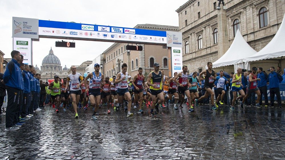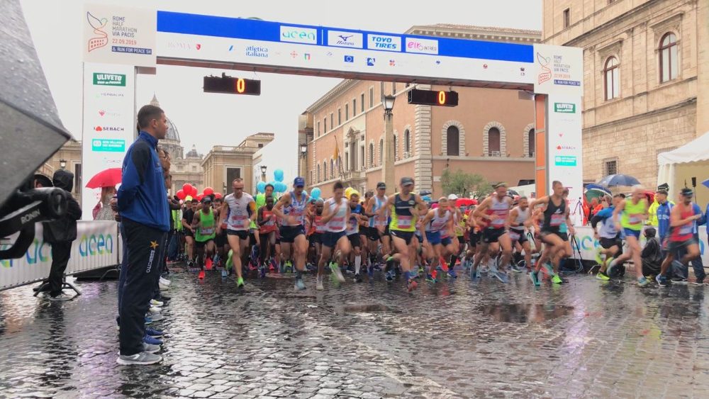 Papa Francesco li saluta per primi, dopo la preghiera dell’Angelus, e loro applaudono e ringraziano nelle loro magliette traspiranti ancora bagnate di sudore e di pioggia. Sono i 2700 partecipanti alla terza edizione della “Via Pacis”, la mezza maratona interreligiosa e i quasi 5000 che hanno animato, con palloncini e balli, la 5 km non competitiva “Run for Peace”.