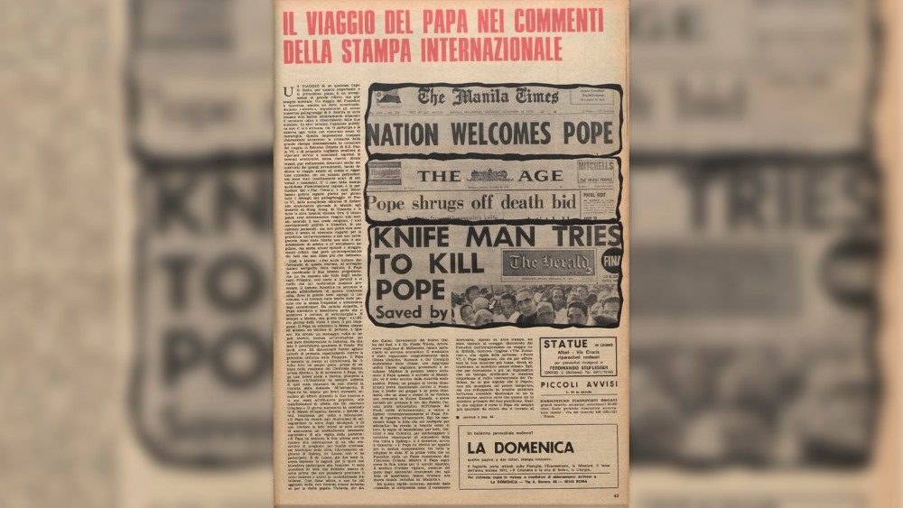Il mattino del 27 novembre, appena sbarcato all’aeroporto di Manila, Paolo VI subisce un attentato che poteva costargli la vita. “Per ogni viaggio”, ha ricordato nelle sue memorie il segretario particolare don Pasquale Macchi, “il Papa fu avvertito che era previsto qualche possibile attentato, a partire dal viaggio in Terra Santa fino all’ultimo in Estremo Oriente. Sempre i servizi segreti misero in allarme la Segreteria di Stato. E ogni volta il Papa affrontò i viaggi senza alcuna preoccupazione, confidando in Dio”. Questa volta però il Papa viene colpito.