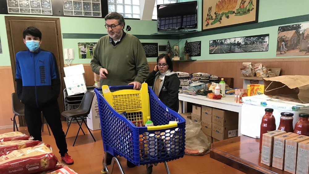 Don Luigi e i suoi collaboratori mettono anche verdura fresca nel carrello per la famiglia in difficoltà