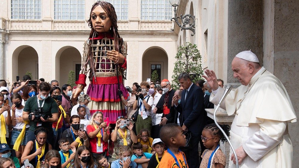 Il Cortile di San Damaso in Vaticano si è popolato di un centinaio di piccoli partecipanti all'iniziatva legata alla Giornata del migrante e del rifugiato. Il Papa li ha invitati a giocare e li ha benedetti. In precedenza avevano fatto tappa in Piazza San Pietro dov'è approdata la marionetta Amal, simbolo dei profughi in cerca di una nuova patria