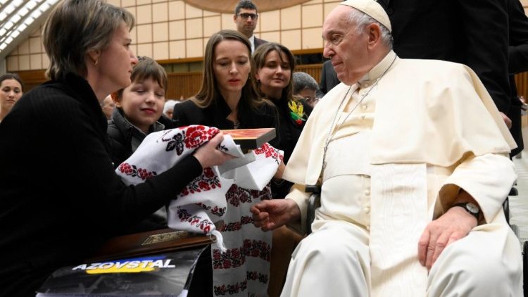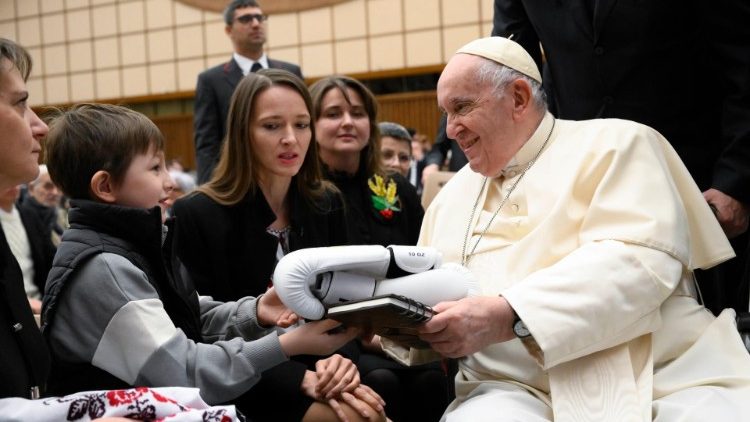 Al termine dell'udienza generale, Papa Francesco ha incontrato la moglie e il figlio di uno dei prigionieri di guerra ucraini. Seduti tra le prime dei fedeli in Aula Paolo VI, la donna e il bambino hanno parlato per qualche istante con Francesco al quale hanno donato i guantoni del papà pugile e un calendario con le devastazioni avvenute nell'acciaieria Azovstal di Mariupol, della quale, dopo i ripetuti attacchi dei mesi scorsi, sono rimaste solo rovine.