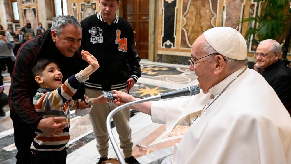 Mentre pronuncia il suo discorso, il Papa viene interrotto da una bambina che si avvicina a lui e gli consegna un regalo: "Vieni, vieni, vieni: eh, brava! Questo è per me? E sei brava: brava! Questa è la innocenza creativa dei bambini: sono come sono e fanno". Poi un'altra bimba la segue e altri e altri ancora, finché il Papa è circondato da piccoli: "Vieni tu da me, vieni anche tu: un’altra brava … E possiamo dare loro questi due rosari, portate due rosari bianchi, due bianchi", dice, aggiungendo: "È meglio questo del discorso, eh? Questo è il vostro discorso, questa spontaneità…". Francesco si intrattiene quindi con i piccoli, a cui si aggiungono altri adulti malati. Chiede loro i nomi - Emanuele, Samuel, Carla, Dario -, consegna i Rosari, distribuisce carezze e benedizioni. Come a una donna che dice: "Le chiedo una preghiera per la mia diagnosi, che ancora non abbiamo trovato".