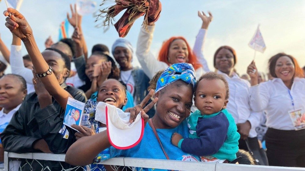 Alcuni hanno dormito per due notti di fila nella spianata verde dell’Aerodrome di N'Dolo, sulle rive del fiume Funa, per guadagnarsi i primi posti dietro le transenne e magari riuscire a salutare da vicino le “père François”. Sono venuti da Kinshasa, ma anche da Brazzaville e altre città e Paesi vicini. “Vive le Pape, vive le Pape!”, gridano agitando bandierine con l’immagine del Pontefice, non interrompendo mai i movimenti di spalle e bacino al ritmo cadenzato dei canti che, con chitarre elettriche e pianola sintetica, il grande coro prova dalle 7 di questa mattina. Sono oltre un milione i fedeli venuti per la prima Messa “per la pace e la giustizia di Francesco” nella Repubblica Democratica del Congo, celebrata secondo il Messale romano per le diocesi dello Zaire.