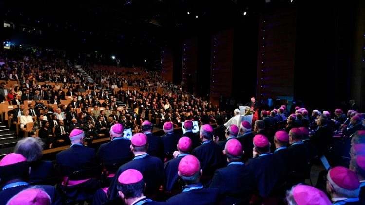 Papa Francesco conclude i Rencontres Méditerranéennes, l’evento che prosegue il cammino di Bari (2020) e Firenze (2022) che gli ha dato l'occasione di visitare questa città meridionale della Francia che definisce "sorriso del Mediterraneo" e "capitale dell’integrazione dei popoli". Intorno a lui ci sono i vescovi delle cinque sponde del Mediterraneo; nel parterre sindaci e autorità delle città e dei territori bagnati dal mare. In prima fila sono seduti il presidente Emmanuel Macron e la moglie Brigitte, che lo hanno salutato all’ingresso e che applaudono ascoltando passaggi del discorso.