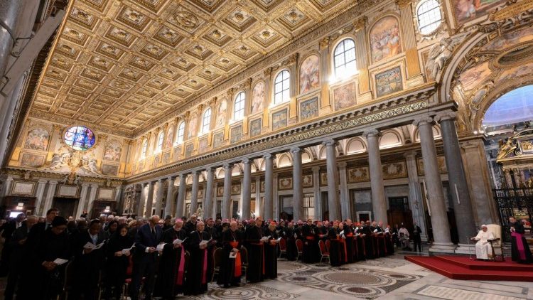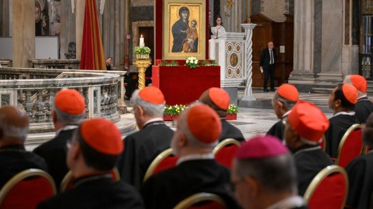 Francesco scandisce la sua preghiera-appello dopo aver recitato le decine del Rosario insieme a centinaia di persone sedute nella Basilica liberiana. Tra questi, tutti i partecipanti al Sinodo sulla Sinodalità, membri della Curia romana e del Corpo diplomatico accreditato presso la Santa Sede. A Santa Maria Maggiore il Papa è arrivato in anticipo, dall'ingresso centrale, accarezzando una bambina e salutando i fedeli. Molti altri, venuti dai quartieri vicini, sono fuori sul sagrato a seguire sui maxi schermi la celebrazione, ripetendo ad alta voce l'Ave Maria sotto un cielo ancora terso. All’interno, nella penombra delle candele e dei fari che illuminano affreschi e mosaici, Francesco siede su un palchetto rosso, lo stesso utilizzato per tante altre celebrazioni qui a Santa Maria Maggiore. Un bambino e una bambina gli hanno portato poco prima una candela e una corona di fiori che il Papa ha posto ai piedi della Salus Populi Romani, soffermandosi da solo in silenzio per qualche istante.