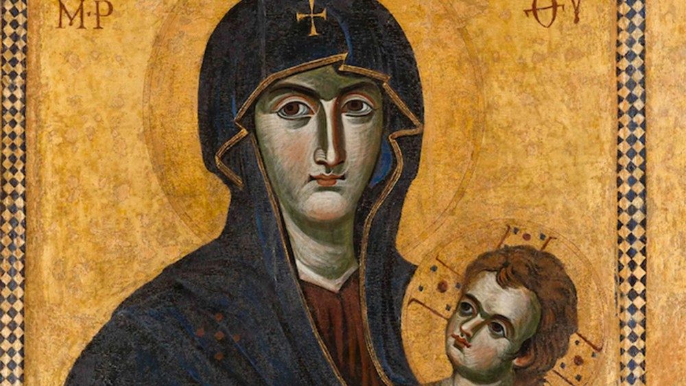 La sacra immagine risale, secondo le ultime ricerche e i restauri recenti, tra IX e XIII secolo. È un dipinto su tavola di tiglio, raffigurante il mezzobusto della Vergine con il Bambino in braccio stretto a sé. Un manto, il maphorion bizantino, di un blu profondo e orlato d’oro, le incornicia il volto scendendo ad avvolgerla con un panneggio di pieghe morbide. Anche la tunica che si intravvede sul petto e nelle maniche è decorata in oro. Il volto è un prezioso ovale di pennellate bianche, verdi e rosate tra luci e ombre che le scolpiscono il naso stretto, le sopracciglia folte, i grandi occhi castani dallo sguardo intenso e lontano, dolcissimo. La bocca è piccola, secondo i canoni della bellezza perfetta medievale e sembra accennare un sorriso. Le sue mani sono incrociate con un gesto molto familiare delle donne che così possono tenere saldamente i bambini. La resa è naturalistica tanto che sul dorso della mano sottostante si vedono le pieghe della pelle increspata dal peso di Gesù che le grava sul braccio. Questo, tra gli altri indizi stilistici, porta a collocare la sua realizzazione nell’ambito romano alto medievale.