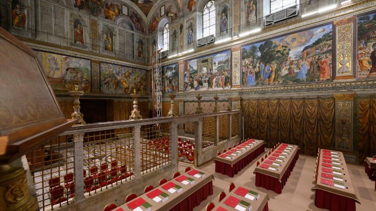 Le immagini dei media vaticani con la Cappella michelangiolesca allestita per accogliere i cardinali che da domani, 7 maggio, si riuniranno per eleggere il nuovo Romano Pontefice. Allestita anche la cosiddetta "Stanza delle Lacrime", dove il Papa neo eletto indosserà per la prima volta la talare bianca