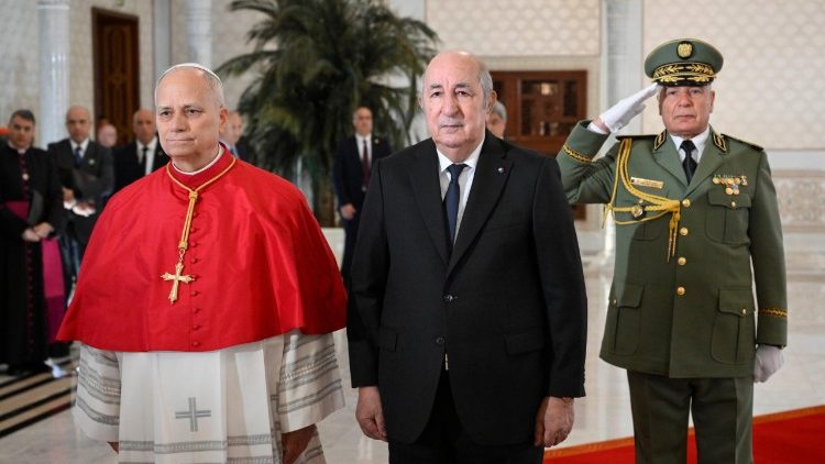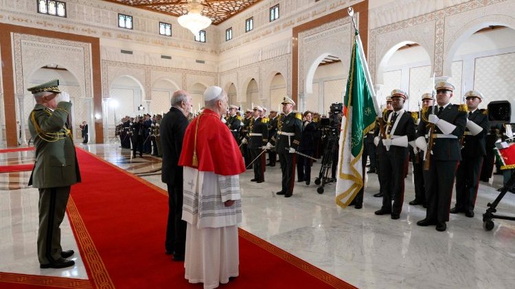 Bandiere con i colori del Vaticano sventolano accanto a quelle algerine nello scalo Houari Boumédiène, il Papa arriva sotto la pioggia ma tra gli onori che gli riserva la Guardia d’onore con lo sparo di 21 colpi di cannone. Ad accoglierlo il Nunzio Apostolico, monsignor Javier Herrera Corona, e il presidente della Repubblica Algerina Democratica e Popolare, Abdelmadjid Tebboune, con cui il Papa ha un breve incontro al Salon d’Honneur.