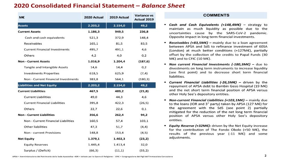 Il Consiglio dell’Economia sta lavorando allo sviluppo di una politica di investimenti; nel 2020 un gruppo ha lavorato alla progettazione di un comitato per questo scopo. Mentre queste politiche generali vengono delineate e implementate, lo IOR ha già aggiornato e rinnovato il suo team per gli investimenti e l’APSA sta introducendo nuove politiche d’investimento immobiliari e mobiliari più efficienti e trasparenti.