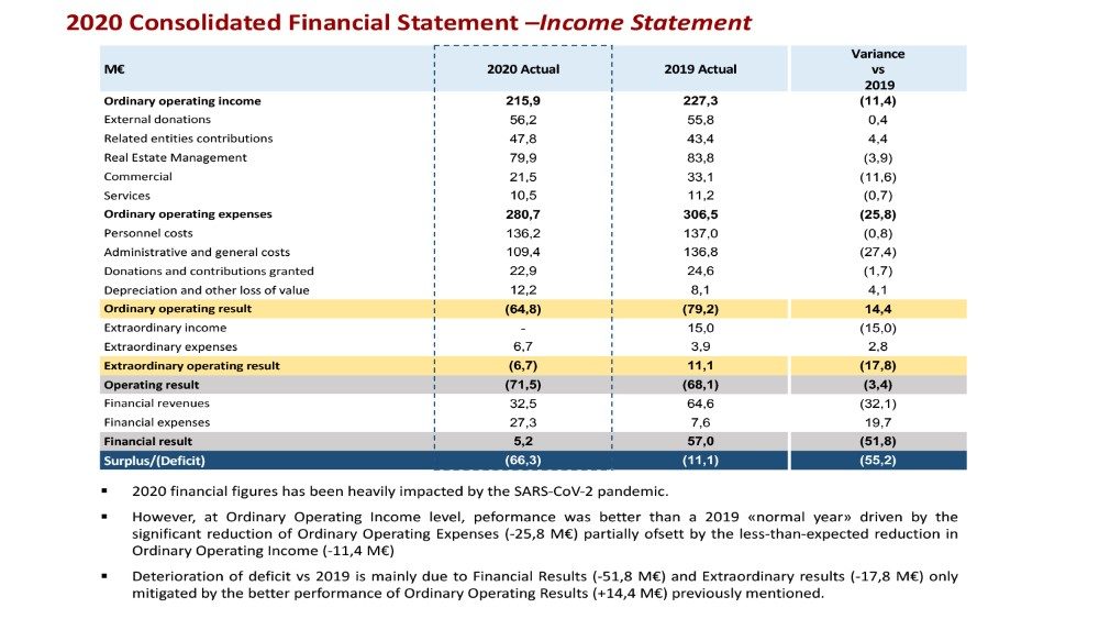 Così abbiamo rivisto il bilancio in marzo accettando un deficit di 82 milioni di euro. Il risultato che si è invece verificato, con un deficit di 66,3 milioni di euro, è stato leggermente migliore del migliore degli scenari ipotizzati, e decisamente migliore di quanto avevamo previsto nel bilancio rivisto in marzo. La buona notizia è che, grazie agli sforzi fatti, i risultati si avvicinano molto a quelli di un anno normale. Il deficit ordinario è inferiore di 14,4 milioni di euro rispetto al 2019: 64,8 milioni di euro nel 2020, rispetto ai 79,2 milioni di euro del 2019. Questo è senza dubbio un risultato migliore. Tuttavia, il rendimento degli investimenti finanziari è stato inferiore di 51,8 milioni di euro e anche il risultato straordinario è stato inferiore di 17,8 milioni di euro.