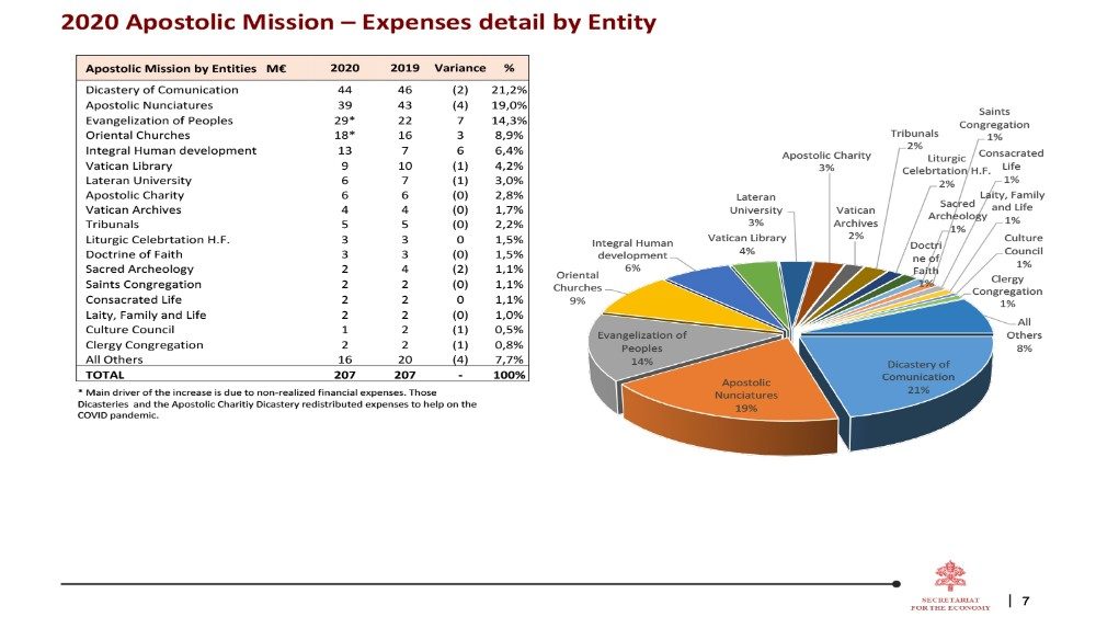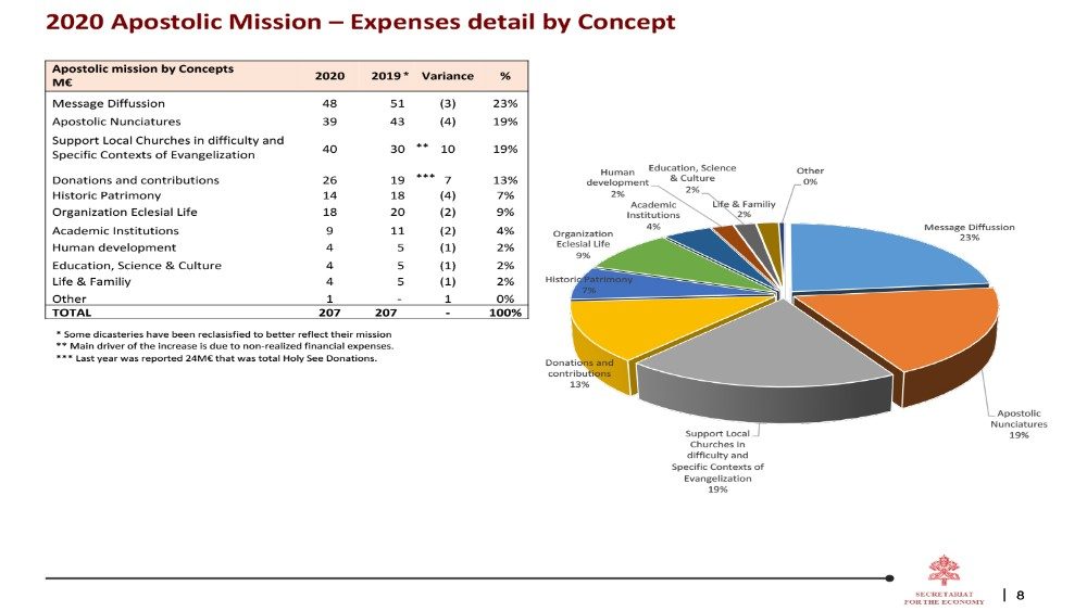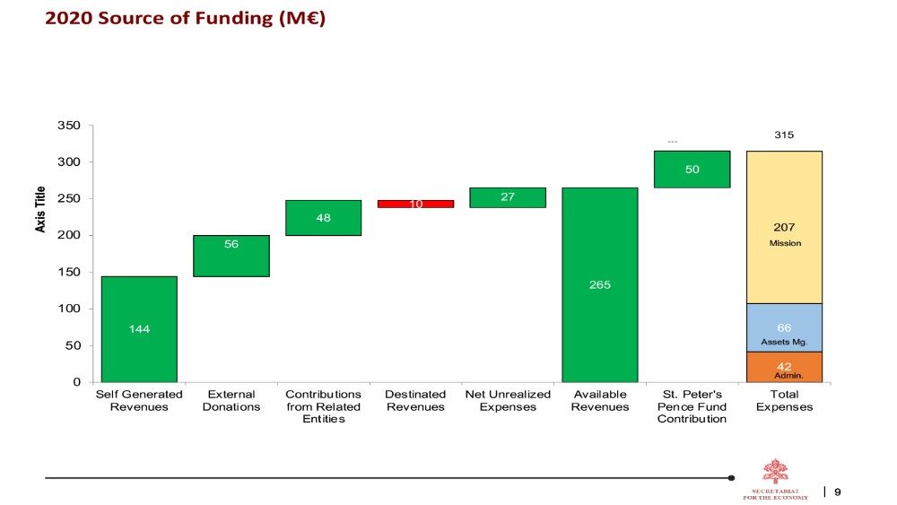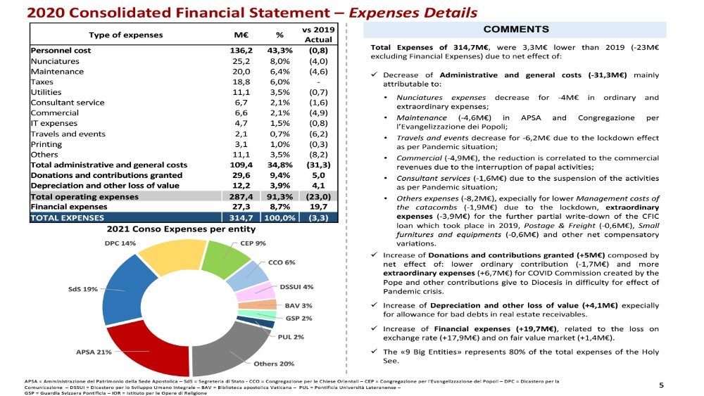 Rispetto al 2019 abbiamo ridotto in misura diversa tutti i capitoli di spesa. Abbiamo ridotto maggiormente i viaggi e gli eventi, 6,2 milioni di euro, il 75% in meno rispetto all’anno precedente. Un’altra voce impropriamente chiamata “commerciale” è stata ridotta di 4,9 milioni di euro. Molti lavori di manutenzione sono stati rinviati, il che ha comportato una minore spesa di 4,6 milioni di euro. Anche le nunziature hanno stretto la cinghia e hanno ridotto le loro spese di 4 milioni di euro e la stessa sorte è toccata ai servizi di consulenza, che sono stati ridotti di 1,6 milioni di euro, il 19% in meno dell’anno precedente. L’unico capitolo di spesa che non è diminuito sono le tasse, che sono state pagate praticamente come l’anno scorso: 18,8 milioni di euro.