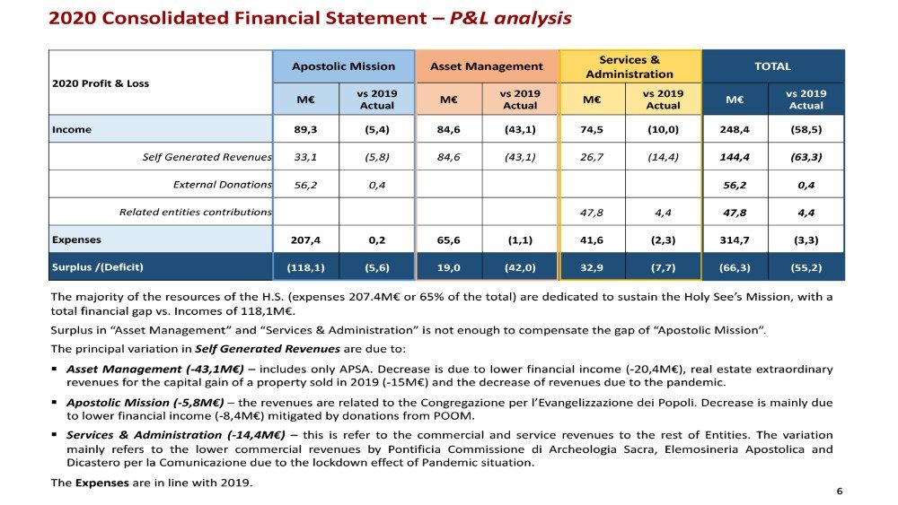 Gli enti inclusi nel bilancio qui presentato sono di dimensioni molto diverse. Nove dicasteri amministrano il 95% delle entrate totali della Santa Sede e ne spendono l’80%. Le fonti di reddito sono già note: 58% (68% nel 2019) generate internamente (affitti, investimenti, visitatori e servizi resi); 23% (18% nel 2019) donazioni esterne (da diocesi o da varie altre istituzioni) e la terza fonte, 19% (14% nel 2019), proviene da entità collegate, (come IOR o Governatorato). Le entrate totali sono diminuite di 58,5 milioni di euro, il 19%, tutte su entrate generate internamente che dipendono dai visitatori e dalla situazione economica generale.