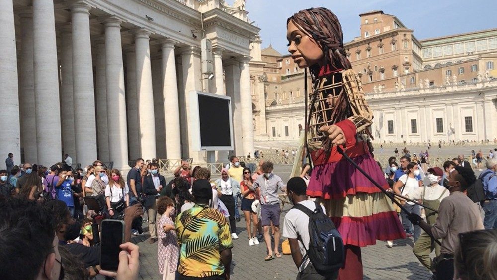 Il cardinal Czerny dà il benvenuto ad Amal, alta 3,5 metri e manovrata all’interno da un burattinaio e all’esterno da altri due, vicino al monumento “Angels Unawares”, la scultura in bronzo che raffigura un gruppo di migranti all’interno del colonnato del Bernini. “Cara Amal, puoi riposarti nella tenda – quella preparata dagli scout del gruppo Roma 51 - ma presto riprenderai il tuo cammino”. Infatti il festival itinerante The Walk, che accompagna Amal, è partito da Gaziantep, vicino al confine turco-siriano, e percorrendo più di 8 mila chilometri, arriverà a Manchester, nel Regno Unito, con la grande marionetta che raffigura una giovane rifugiata di circa 9 anni, e che rappresenta idealmente tutti i bambini sfollati, molti dei quali separati dai loro genitori.
