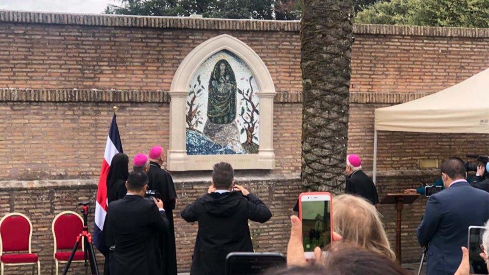 Da oggi chi visita i Giardini Vaticani potrà conoscere in modo più approfondito la storia della Virgen de los Ángeles, Patrona del Costa Rica. Con una cerimonia ufficiale, questa mattina è stato infatti inaugurato il mosaico che rappresenta la "Negrita", come viene affettuosamente chiamata dai fedeli. L'opera è stata realizzata dall'artista Paula Sáenz, che ha composto l'immagine usando frammenti di alcune antiche pietre della seconda Basilica di Cartago, altri provenienti dal luogo del ritrovamento dell'immagine e dalle diverse diocesi del Paese. Le tonalità più sugggestive del mosaico sono realizzate con pietre di fiumi e vetri con lamine d'oro.
