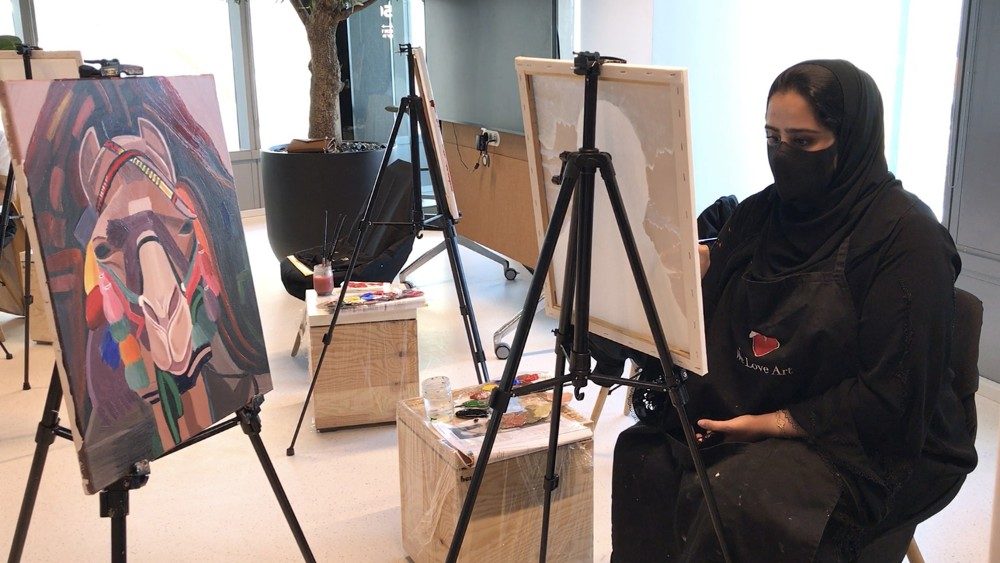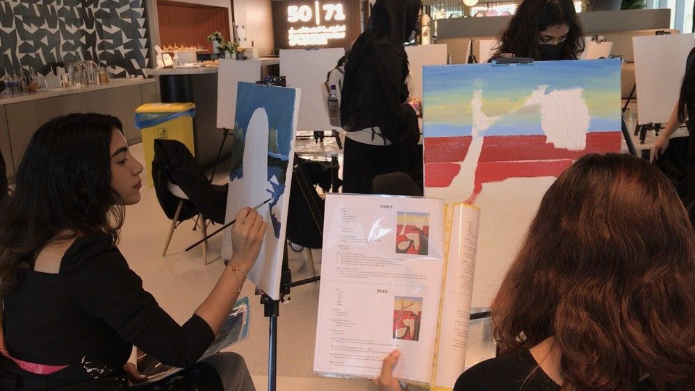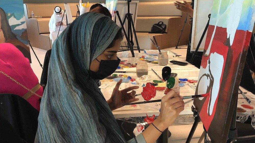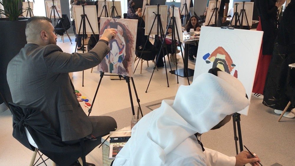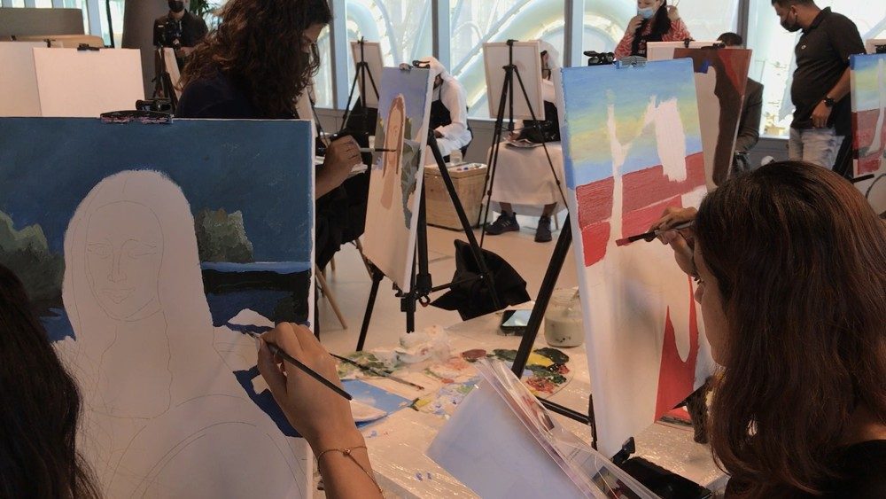 Nel pomeriggio, una ventina di giovani studenti universitari degli Emirati e di altri Paesi del mondo, musulmani, indù, cristiani ed ebrei, sono stati protagonisti per quattro ore di una sessione di pittura, guidati dalle artiste internazionali del gruppo “We love art”. In una sala all’interno del Padiglione degli Emirati Arabi Uniti, che si affaccia sulla grande cupola aperta di Al Wasl, cuore pulsante dell’Expo, hanno dipinto insieme nello spirito della Fratellanza umana. Seguendo le indicazioni iniziali di Denise Schmitz, artista fondatrice di “We love art”, e delle sue collaboratrici, ma secondo la propria personale sensibilità, hanno riprodotto sulla tela la Gioconda di Leonardo, la Persistenza della memoria di Dalì e il muso di un cammello, opera della stessa Schmitz.
