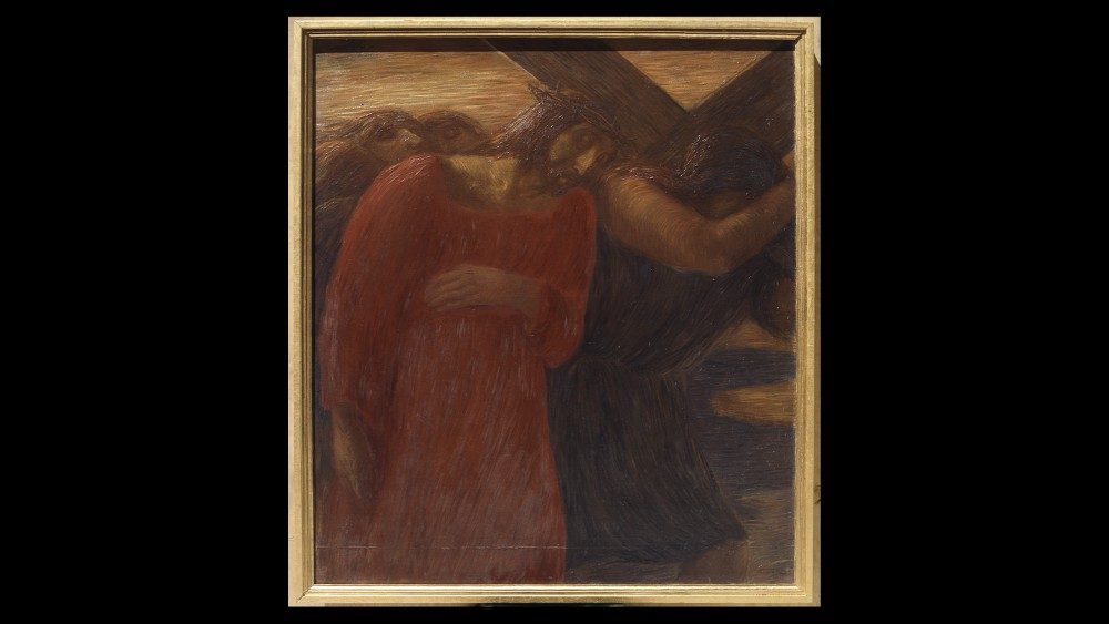 “La disposizione ravvicinata – scrive Micol Forti, curatrice della Collezione d’Arte Contemporanea dei Musei Vaticani, nel volume su Gaetano Previati pubblicato dalle Edizioni Musei Vaticani e presentato nei giorni scorsi -  attiva un movimento reale, interno all'opera-polittico, che si svolge, nel tempo e nello spazio, di fronte all'osservatore, come se egli stesse osservando da una finestra. Non siamo noi a muoverci per raggiungere la stazione successiva, come avviene all'interno di un edificio sacro. La figura di Gesù avanza, cade, si rialza: è sempre davanti ai nostri occhi, in primo piano, impedendo di guardare altro o altrove se non il suo incedere e il suo volto”. “È schiacciata dal peso di una sofferenza che va al di là del martirio. Il suo corpo gracile, curvo, il volto basso dai contorni sfuggenti, si deforma sotto il peso del legno, si contorce ai colpi del martello, è abbandonato ormai esangue dopo l'ultimo respiro”.