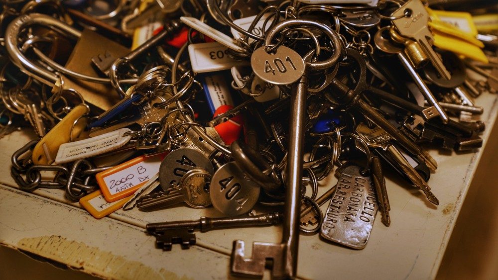 I garriti dei gabbiani riecheggiano tra le quattro mura del Cortile della Pigna. Di fronte al bistrot che nel giro di poche accoglierà visitatori da ogni parte del mondo, il clavigero apre una porta: introduce al bunker che custodisce, protette da un sistema di condizionamento studiato per contrastare la ruggine, le 2798 chiavi che aprono gli 11 settori dei Musei del Papa. Settimanalmente vengono testate, una ad una, per verificare il funzionamento delle serrature e accertarne l’integrità. Ad ogni esemplare corrispondono da una a cinque copie.
