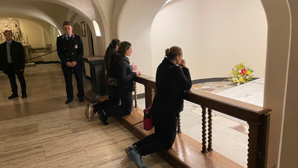 Tre ragazze pugliesi sono state le prime ad accedere e, quasi correndo, si sono recate all'inginocchiatoio per pregare dinanzi alla lastra in marmo con l'epigrafe nera "Benedictus PP XVI", affiancata da due vasi di fiori: "Era un Papa importante, abbiamo sentito il bisogno di essere qui oggi", dicono al gruppo ristretto di giornalisti presenti nelle Grotte vaticane. "No photo, just pray!", raccomandavano intanto i sampietrini, man mano che si ingrossava il flusso di visitatori. Tutti in effetti, come già davanti alla salma, sono rimasti in silenzio, a farsi il segno della croce o chinare il capo, pregando per colui che per otto anni è stato Pontefice e per quasi dieci anni Papa emerito. Tra loro c'è un uomo di Varsavia che definisce Benedetto "uno dei Papi più importanti della storia". Dietro di lui un gruppi di donne provenienti dalla provincia di Venezia, che hanno voluto esprimere la loro "vicinanza": "Benedetto ci dà speranza".