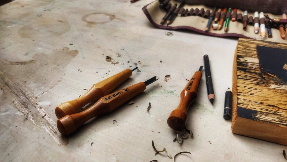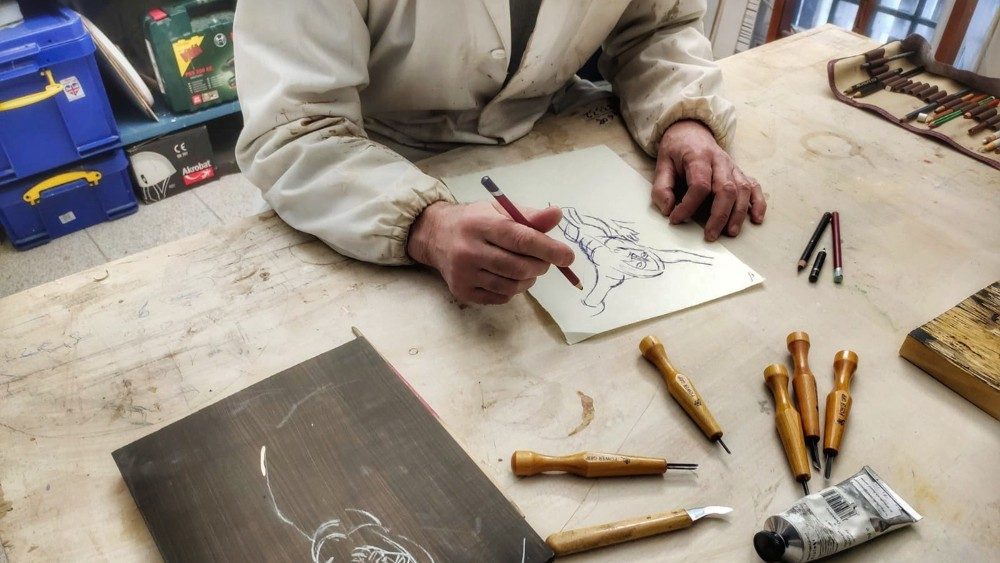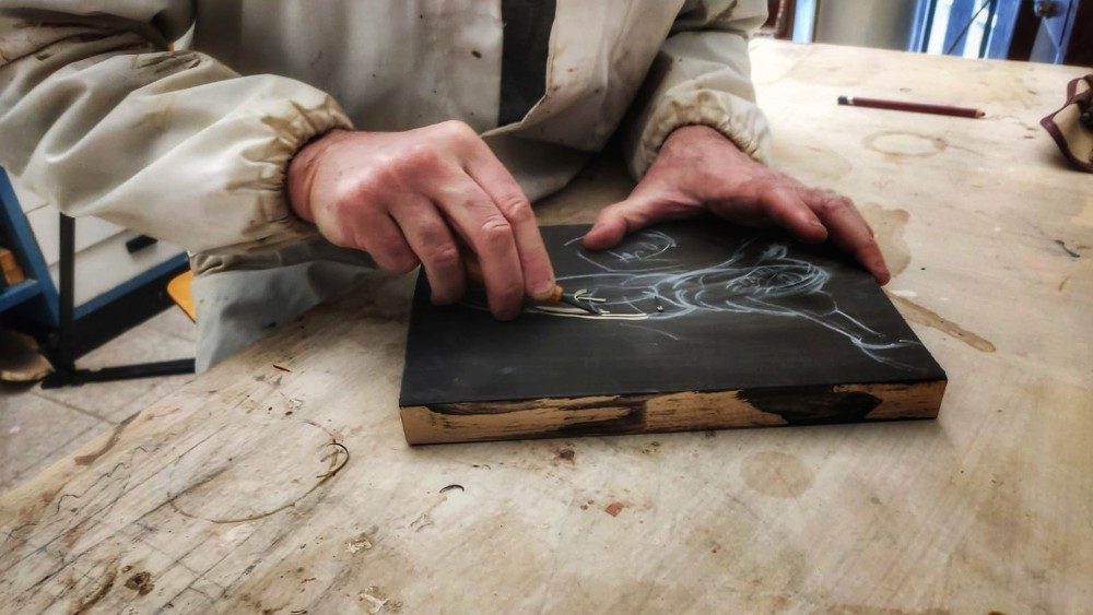 “Di questi fogli esistono ancora le matrici in legno”. Viani utilizzava la sgorbia, un particolare tipo di scalpello con una lama sagomata. “Sembrava incidesse indecifrabili geroglifici. Nel momento in cui però si andavano a stampare, le immagini assumevano la delicatezza e la poeticità di queste forme di compianto che hanno nella figura della Madonna l’immagine di tutte le donne del mondo”.