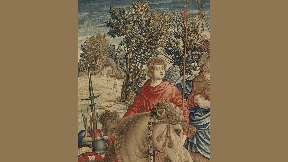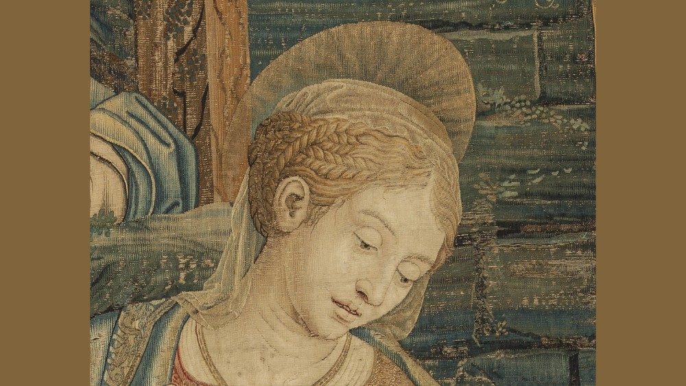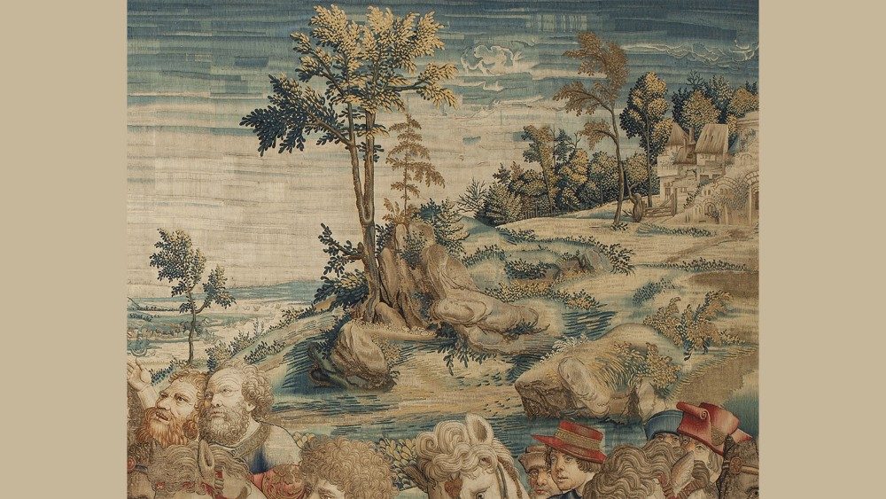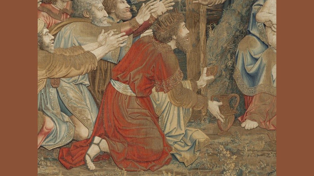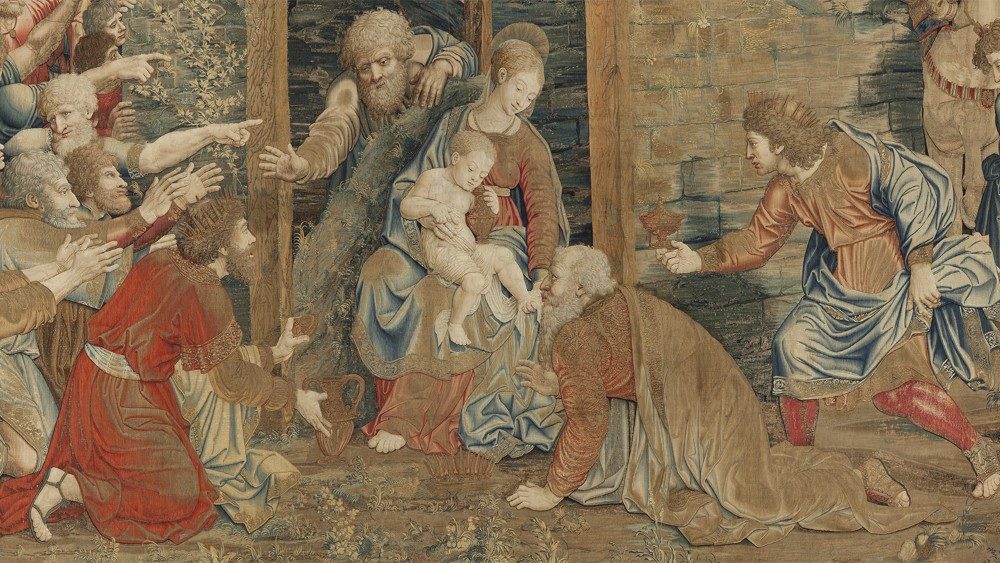 Manifattura Fiamminga, Bruxelles, bottega di Pieter van Aelst (m. Bruxelles 1532); cartone della scuola di Raffaello Sanzio, Adorazione dei Magi, 1524 - 1531, arazzo; ordito: lana; trama: lana, seta e argento dorato, cm 557 x 685, Musei Vaticani, Galleria degli Arazzi, © Musei Vaticani