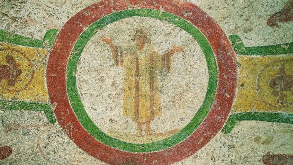 Una figura femminile in preghiera, con il capo coperto da una stola bianca frangiata e vestita con una lunga tunica rossa, dalle maniche ampie ed eleganti che sottolineano il gesto delle braccia aperte e le mani rivolte verso l’alto; gli occhi sono rivolti al cielo - le si vede anche il bianco della sclera - come a voler attraversare il soffitto e raggiungere il cielo fin dalle viscere della terra. Si tratta di un affresco della lunetta del cubicolo della Velata, nelle catacombe di Priscilla, databile al III secolo. È l’immagine che quest’anno caratterizzerà la VII Giornata delle Catacombe - Edizione primavera, che si terrà sabato 2 marzo con numerose iniziative. Il tema ha un titolo quanto mai suggestivo: Dal ricordo alla preghiera. L'evento, spiega monsignor Pasquale Iacobone, presidente della Pontificia Commissione di archeologia sacra, si “inserisce già nel clima del Giubileo": “Come sappiamo, il Papa ha voluto che quest'anno di preparazione al Giubileo fosse dedicato alla preghiera, così abbiamo pensato che la visita alle catacombe, alle memorie e alle testimonianze possa essere un'occasione importante per una pausa di riflessione, quindi anche di preghiera".