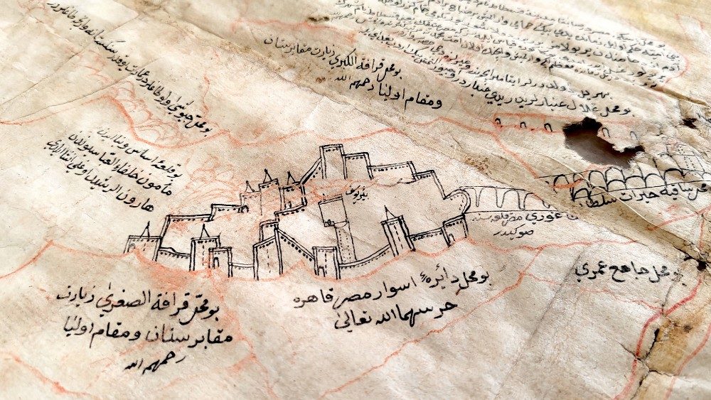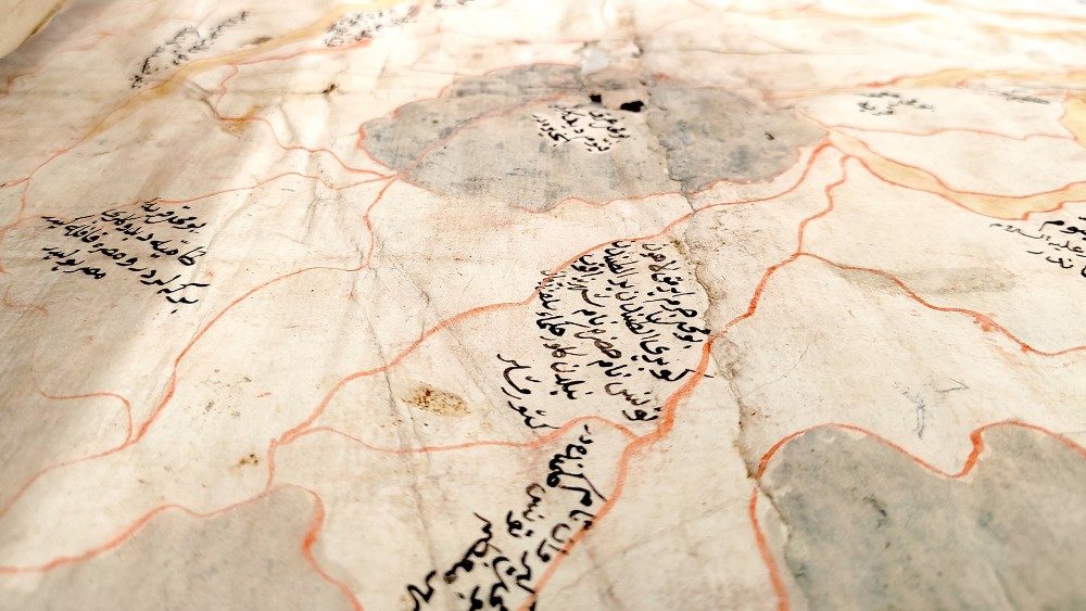 “Fu acquistata nel 1739 a Costantinopoli dal libanese Giuseppe Alemanni, che nel 1736 diventerà Prefetto della Biblioteca e terrà questa mappa nella sua collezione. Si riferisce direttamente all’opera di un famoso viaggiatore ottomano, Evlija Cselebi, che nel 1683 attraversò l’Egitto dal Cairo fino alle sorgenti del Nilo”, riportando i dettagli del “viaggio più ampio intrapreso su tutto il territorio dell'impero ottomano nel periodo della sua massima estensione, nei dieci volumi del suo celebre libro di viaggio”, il Siyāḥat nāme. I testi, in turco ottomano, presenti sulla mappa rimandano puntualmente a quanto scrive sui diari. “La mappa – prosegue Delio Proverbio – è databile attorno al 1685 e alla Biennale di Jeddah è esposta in un unico ambiente accanto ad una mappa sorella, probabilmente prodotta nello stesso atelier, relativa al Golfo Persico, oggi conservata nella collezione della Biblioteca Nazionale del Qatar”.