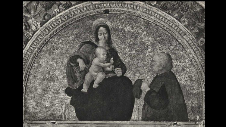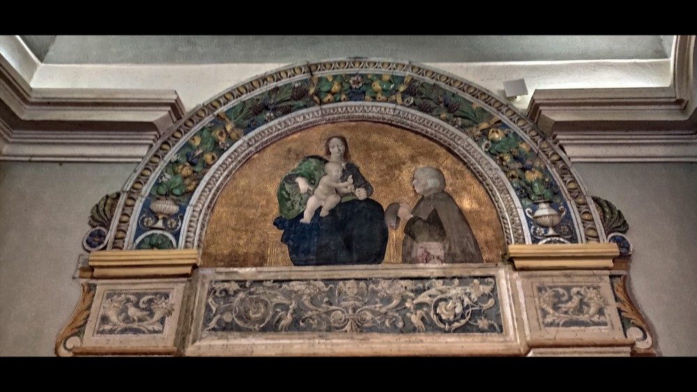 Tra le opere ve n’è una poco conosciuta, un affresco, che un tempo si trovava in una lunetta all'ingresso del chiostro e poi fu trasportata al primo piano. Attualmente sovrasta una porta tra gli ambienti adibiti a museo dedicati a Torquato Tasso. Sul fondo, a imitazione di un mosaico monocromo dorato, si stagliano, quasi come ritagliate, le figure della Madonna con Bambino e donatore. Mentre l’uomo, di profilo con il cappello tenuto tra le mani in segno di rispetto, rimane rigido nel suo profilo un po’ tozzo a mezzo busto, i gesti della Vergine e del Figlio rimandano in modo inequivocabile alla sfera di Leonardo. La Vergine ha il volto reclinato e aperto in un dolce sorriso, il Figlio tutto proteso a benedire l’uomo inginocchiato. L’affresco è racchiuso tra l’architrave, decorato a girali e foglie di acanto con altri motivi classici, e il giro dell’arco ravvivato da un rilievo di tipo robbiano con pigne e foglie uscenti da anfore.