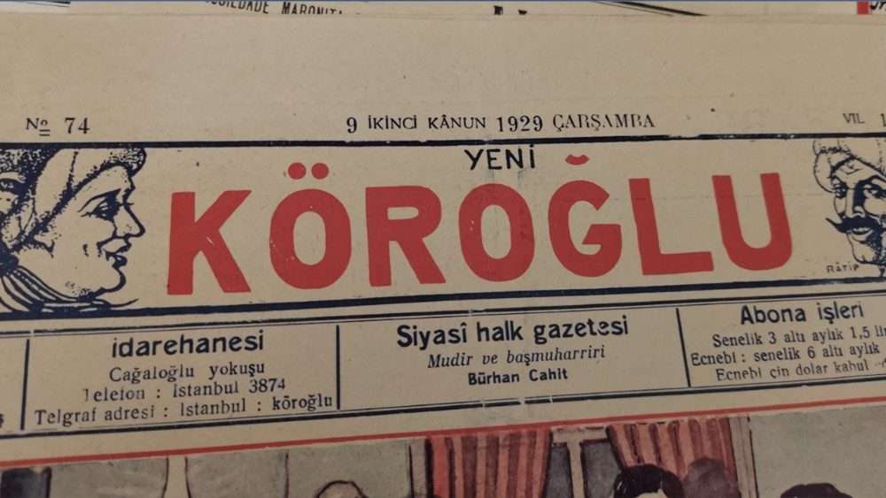 Al 1929 risale una copia del giornale Köroğlu: con la prima guerra mondiale il dominio osmanico è caduto e i suoi territori sono passati sotto il controllo delle potenze alleate, portando alla nascita della moderna Türkiye e dei nuovi stati del Medio Oriente. “Istanbul è divenuta capitale della Turchia”, osserva lo studioso di manoscritti vaticani. “In quell’anno le autorità politiche adottano un nuovo alfabeto per scrivere la lingua turca, abbandonando i caratteri arabi. I giornali aiutano i lettori ad apprendere i nuovi segni grafici”. Sulla copertina di Köroğlu illustrata a colori, è rappresentato un interno domestico in cui più generazioni, dai bambini agli anziani, sono intente a studiare un abbecedario.