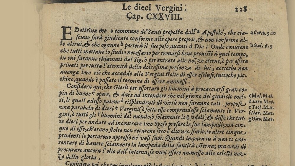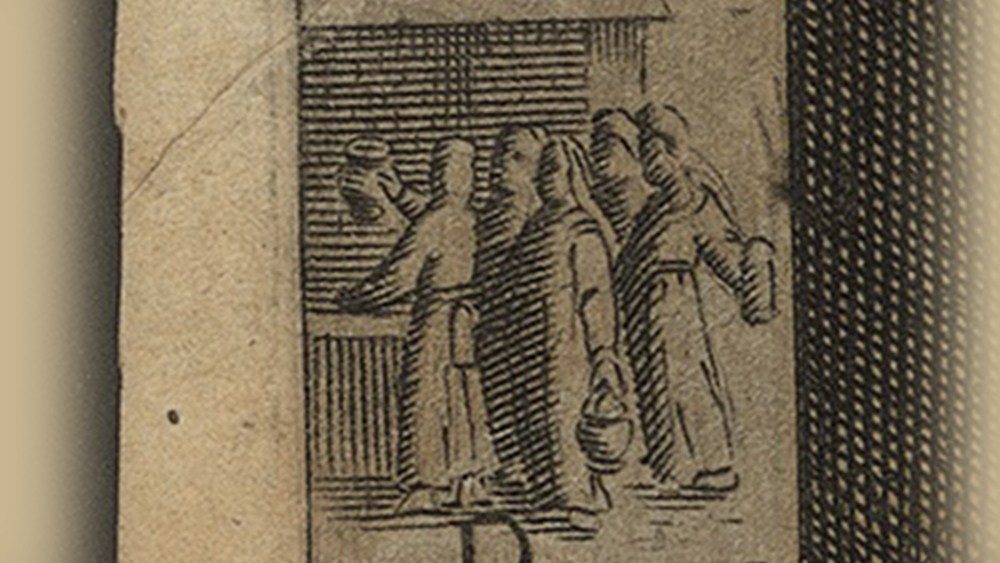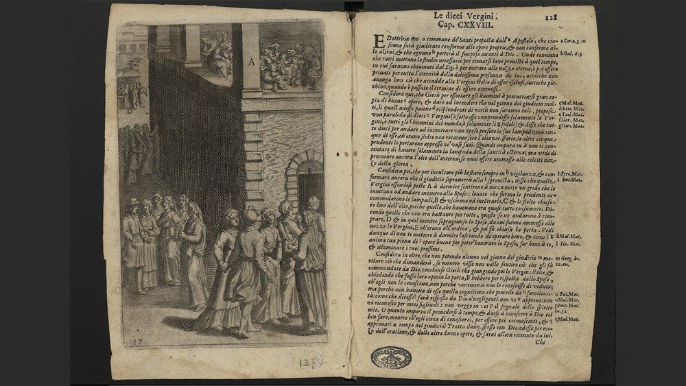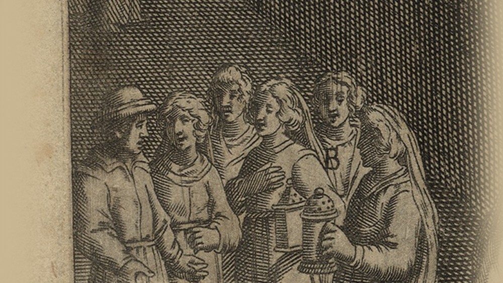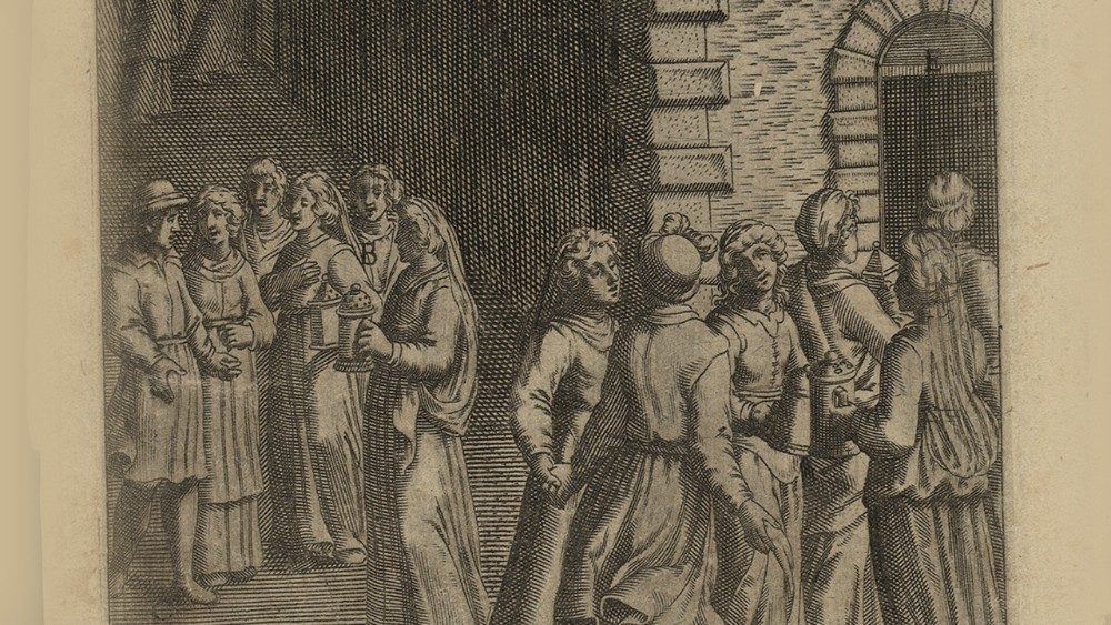 «Il regno dei cieli è simile a dieci vergini che, prese le loro lampade, uscirono incontro allo sposo. Cinque di esse erano stolte e cinque sagge; le stolte presero le lampade, ma non presero con sé olio; le sagge invece, insieme alle lampade, presero anche dell'olio in piccoli vasi. Poiché lo sposo tardava, si assopirono tutte e dormirono. A mezzanotte si levò un grido: Ecco lo sposo, andategli incontro! Allora tutte quelle vergini si destarono e prepararono le loro lampade. E le stolte dissero alle sagge: Dateci del vostro olio, perché le nostre lampade si spengono. Ma le sagge risposero: No, che non abbia a mancare per noi e per voi; andate piuttosto dai venditori e compratevene. Ora, mentre quelle andavano per comprare l'olio, arrivò lo sposo e le vergini che erano pronte entrarono con lui alle nozze, e la porta fu chiusa. Più tardi arrivarono anche le altre vergini e incominciarono a dire: Signore, signore, aprici! Ma egli rispose: In verità vi dico: non vi conosco. Vegliate dunque, perché non sapete né il giorno né l'ora». (Mt 25, 1-13)