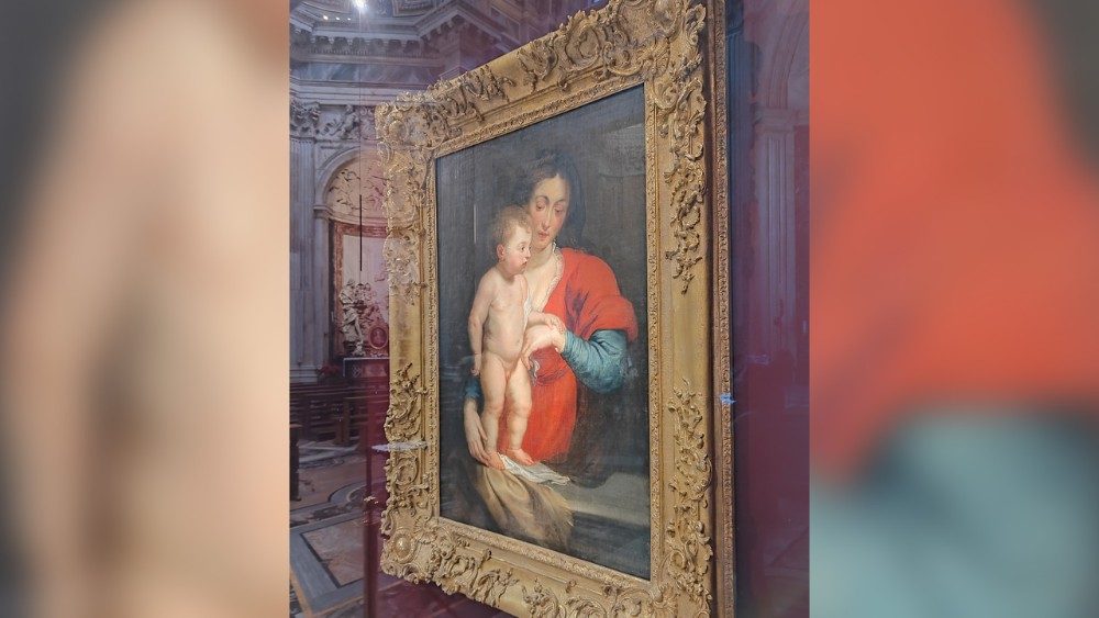 Nella tela di Rubens invece la Vergine Maria presenta e offre, sorreggendolo con delicatezza, il Bambino: è in piedi, nudo sopra un panneggio abbandonato su una trabeazione in pietra. Gesù rivolge lo sguardo verso destra. Quest’opera infatti ricalca l’iconografia di un pannello laterale di un trittico eseguito da Rubens nel 1617. Al centro del polittico aveva rappresentato la Deposizione di Cristo. Dunque il Figlio di Dio, ancora piccolissimo, è già orientato verso il suo destino: dare la vita per l’umanità riscattandola dal peccato e dalla morte. In quest’ottica il panneggio richiama la sindone nella tomba vuota.