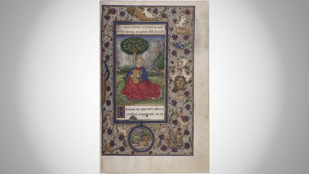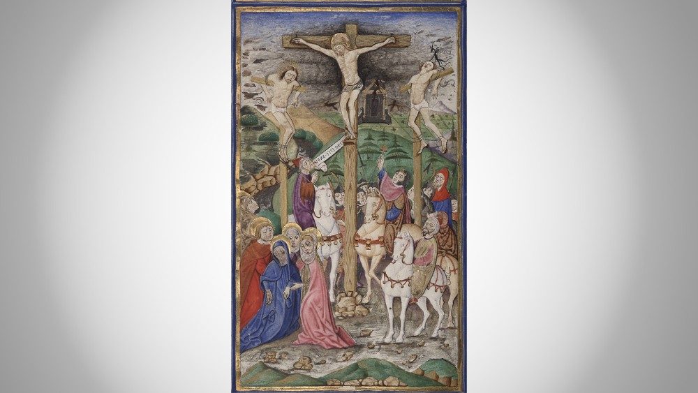 Nel Salterio, identificato come Vat. lat. 3467 c’è una scena che riassume tutti i misteri che contempleremo nelle prossime settimane fino al culmine del Triduo pasquale. Le scene più significative della vita di Cristo e della Resurrezione si sviluppano intorno all’immagine centrale della Crocifissione, consentendo allo spettatore di cogliere con un unico colpo d’occhio il senso più profondo dei misteri della Passione.
