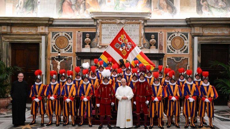 ಹೊಸ ನೇಮಕಾತಿಗಳ ಪ್ರಮಾಣ ವಚನ ಸ್ವೀಕಾರದ ಸಂದರ್ಭದಲ್ಲಿ ಪಾಂಟಿಫಿಕಲ್ ಸ್ವಿಸ್ ಗಾರ್ಡ್ ಅನ್ನು ಸ್ವಾಗತಿಸುತ್ತಾ, ಪೋಪ್ ಲಿಯೋ XIV ಅವರು ತಮ್ಮ ಮೊದಲ ದಿನದಿಂದ ಅವರ ರಕ್ಷಣೆಗಾಗಿ ಅವರಿಗೆ ಧನ್ಯವಾದಗಳನ್ನು ಅರ್ಪಿಸುತ್ತಾರೆ ಮತ್ತು ಜೀವನದಲ್ಲಿ ಅವರಿಗೆ ಏನೇ ಕಾದಿದ್ದರೂ ಭಗವಂತನೊಂದಿಗೆ ತಮ್ಮ ನಂಬಿಕೆ ಮತ್ತು ಸ್ನೇಹವನ್ನು ಬೆಳೆಸಿಕೊಳ್ಳಲು ಅವರನ್ನು ಆಹ್ವಾನಿಸುತ್ತಾರೆ.