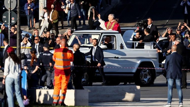 Nusileidęs į aikštę, dar kartą pasveikinęs Romos vyskupijos tikinčiuosius, kunigus ir vienuolius ir jiems pamojavęs, Leonas XIV sėdo į atvirą papamobilį ir už kelių minučių atvyko prie Švč. M. Marijos Didžiosios bazilikos, paskutinės gegužės 25 dienos stotelės.