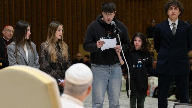 „Ačiū visiems už tai, kad atvykote! Ir ačiū – iš tiesų ačiū! – už tai, kad kartu su manimi mylite mūsų Romos Bažnyčią! Romos Bažnyčia yra gyva! Laiminu jus visus, jūsų artimuosius ir draugus“, – atsisveikino popiežius su Romos vyskupijos jaunuoliais.  (RK / Vatican News)