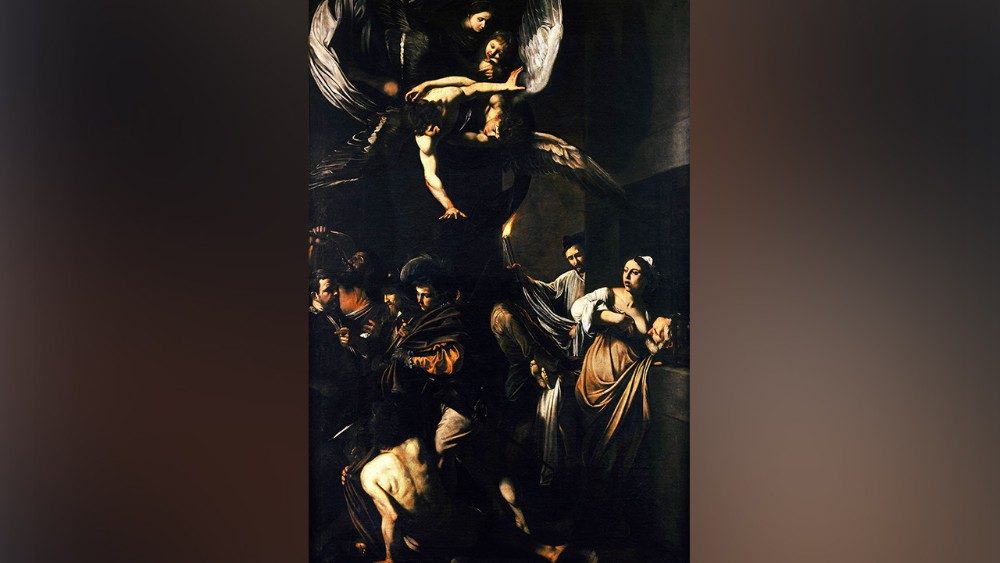 "A tela – recorda Dom Lonardo - foi pintada para a instituição Pio Monte della Misericordia, fundada em 1602 por sete leigos napolitanos que se ofereceram a Nossa Senhora para viver suas vidas na caridade. Caravaggio retrata Nossa Senhora, aquela a quem estes leigos e leigas prometeram suas vidas. As sete obras de misericórdia são identificadas em cinco figuras. São Martinho de Tours que veste os nus e visita os doentes; um estalajadeiro que acolhe um peregrino que tem a concha de Santiago de Compostela, para destacar o valor da peregrinação da Igreja em busca da rosto de Deus; um clérigo com uma tocha enterra os mortos; Sansão recebe água de Deus e bebe com a mandíbula de um burro; por fim, visitando os prisioneiros e alimentando os famintos, Caravaggio representa o clássico episódio retirado da Caritas Romana do velho Cimone preso, condenado a morrer de fome, a quem sua filha Pero oferece leite de seu peito".