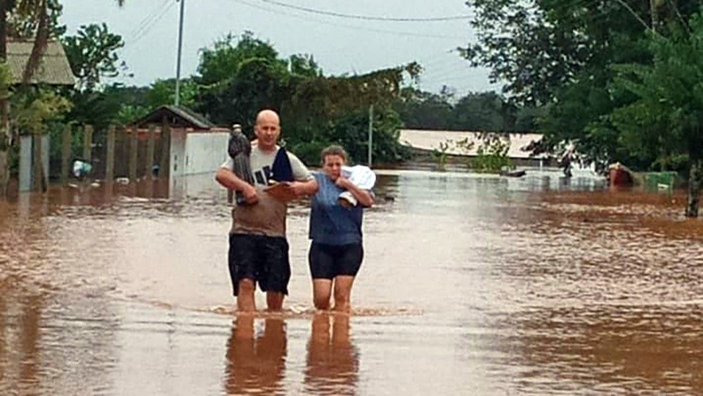 Uma das paróquias mais atingidas próxima à Grande Porto Alegre, ao largo da cidade e Rio Guaíba, foi a da cidade de Eldorado do Sul-RS. Padre Fabiano Glaser dos Santos, pároco do município, disse que a paróquia fica em uma área urbana que foi 100% atingida pelas fortes chuvas. “Tudo virou um só rio”, disse. Das seis igrejas da Paróquia Nossa Senhora Medianeira, somente uma não foi tomada pelas águas porque está em um “distrito chamado Parque Eldorado que não teve inundações”, como referendou o sacerdote empossado há poucos meses na comunidade. Ele mesmo teve que ser socorrido, junto com a família onde estava pra se abrigar, com um caminhão do exército e permanecer em Guaíba até as águas amenizarem. Segundo Pe.Fabiano, “o povo está bastante desanimado porque é a terceira enchente em nove meses” e as pessoas dizem que vão embora da cidade, inclusive lideranças da paróquia, conforme informa o pároco que está tentando manter contato com os paroquianos pelo WhatsApp, por vídeo e tentando se fazer próximo por mensagens de perseverança e otimismo, nessa hora tão triste e desanimadora. Como a água invadiu a casa paroquial, Glaser disse que está abrigado na paróquia Nossa Senhora de Fátima, em Guaíba (RS), uma cidade vizinha, que acolhe no salão paroquial cerca de 140 desabrigados.