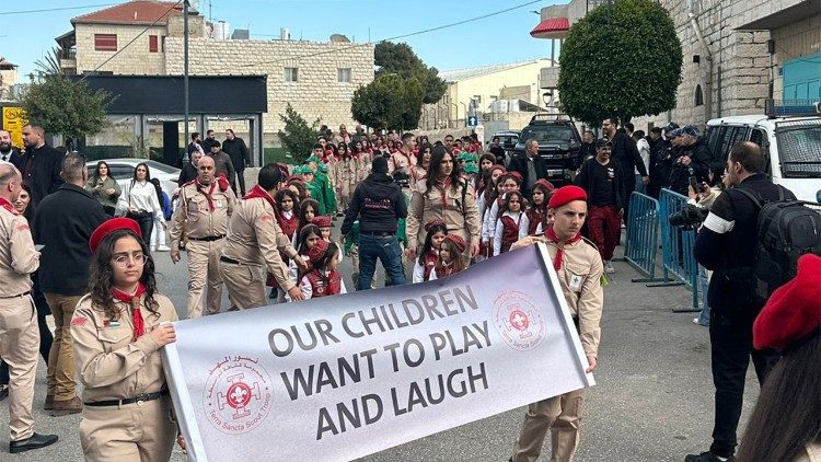 Recepcionaram-no, à frente da multidão, os escoteiros de Belém, exibindo cartazes de boas-vindas e mensagens clamando por uma paz que ainda tarda a chegar. Um dos cartazes dizia: "Nossas crianças querem brincar e rir". A acolhida deste ano, diferente do ano passado, teve maior participação e foi, em geral, mais tranquila, graças às perspectivas de trégua em Gaza, que agora parecem mais próximas.