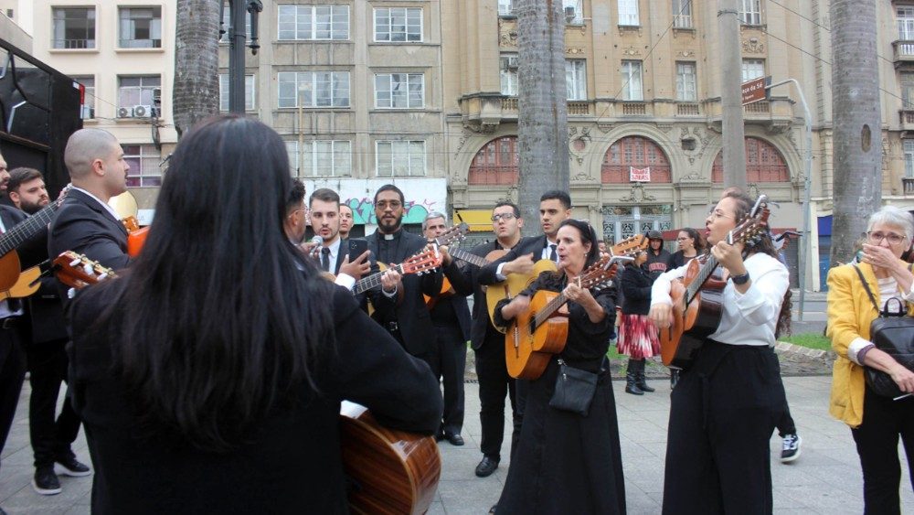 A celebração teve início às 17h, com uma concentração na Praça da Sé. Ali, o Pe. José Folqué —membro da equipe de catequistas itinerantes responsável pelo Caminho no Brasil, ao lado de Raúl Viana e Antonia María Santiago— proclamou o anúncio do Querigma, a Boa Notícia da Salvação, que é um dos aspectos característicos do carisma. Exortou todos a viverem a celebração com profundo agradecimento a Deus pela história realizada até aqui: “O Senhor trouxe os primeiros itinerantes há 50 anos, justamente hoje, 6 de abril de 1975, quando nasceu o Caminho aqui. Celebramos Cristo, que é o autor da vida, aquele que nos salvou. Ele nos amou até o extremo: nunca nos julgou, nunca nos condenou, nunca nos castigou. Como diz o Papa Francisco na Bula de convocação do Ano Jubilar, Spes non confundit: ‘Sou amado, logo existo’ (n. 21). O Senhor nos amou, nos libertou e nos colocou em um Caminho de salvação”.