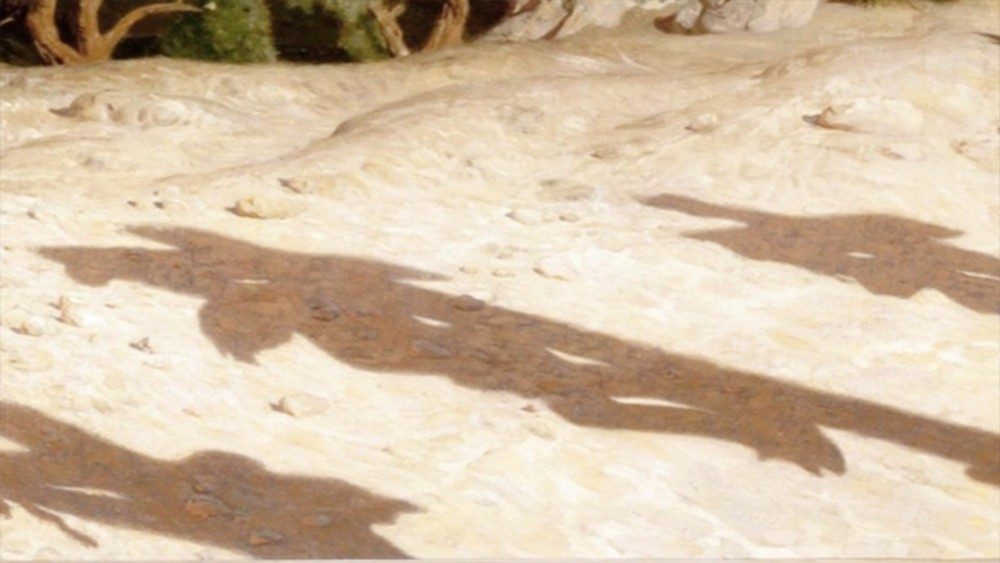 A sombra de Cristo na pintura não testemunha uma ausência, não torna menos dramática a iconografia usual do rosto doloroso gotejando sangue, das mãos e dos pés pregados, do lado ferido; em vez disso, fala perfeitamente às consciências e as sacode até o âmago, faz com que nos sintamos fisicamente presentes sob as três cruzes. A alusão se torna mais real do que a representação e nos leva a buscar novos significados, novas razões.