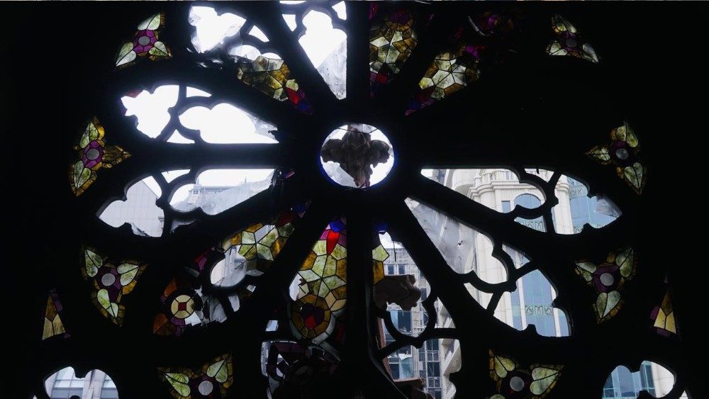 Sim, estávamos precisamente no início da Missa desta manhã, quando houve este ataque aqui na frente. A igreja sofreu graves danos. Aqui é quase no centro, bairro de Holosijivskyj. Os vidros caíram dos vitrais, das torres, do campanário. Quebraram todos os vidros. Esses foram ataques de mísseis balísticos que chegam rapidamente. Quando ouvimos as explosões nós fomos para baixo, para o subsolo, para onde normalmente vamos quando há perigo. A Ucrânia precisa de paz. Estamos tristemente assistindo à destruição de nossa igreja, que hoje foi atingida por mísseis russos. O inimigo está profanando o que é sagrado para nós ucranianos. Depois as pessoas viram o que aconteceu, porque havia vidros quer dentro como fora, e o serviço ucraniano, os bombeiros, etc, imediatamente intervieram, por isso estava tudo isolado e não se podia passar. Mais ou menos as pessoas imediatamente chegaram para ajudar, mas não podemos fazer nada. Esperemos o controle da Comissão do Ministério ucraniano.