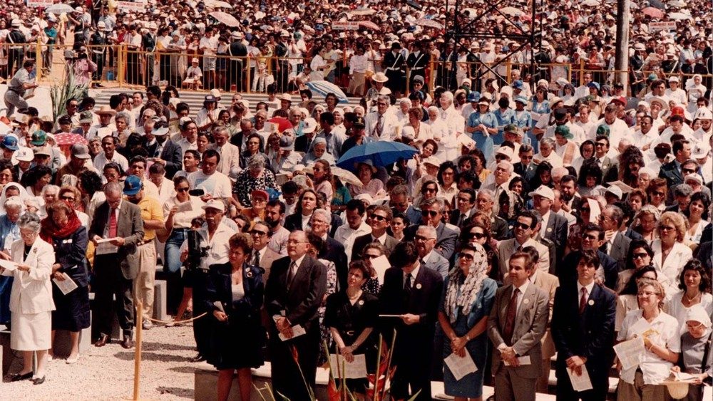 Milhares de pessoas estavam naquele dia no “papódramo” para ouvir o Papa, e o Papa teve para nós também um grande momento de nos fazer descobrir, que sendo Igreja de Cristo, nós somos chamados a seguir o exemplo de nossos mártires. Não podemos nos esquecer jamais desses que deram a sua vida por causa da Eucaristia, da força do Evangelho, da vivência Igreja.