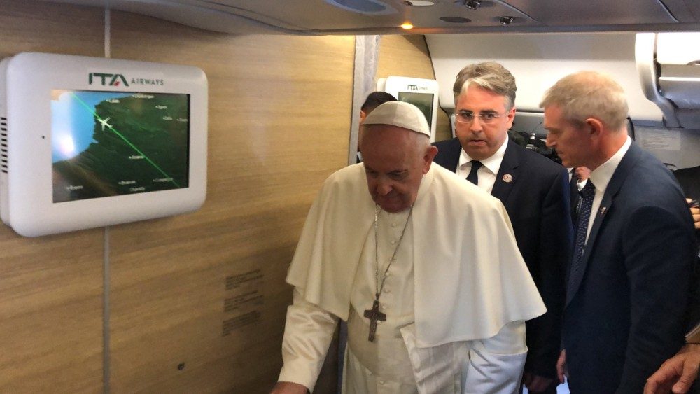 Como costuma fazer logo no início da suas Viagens Apostólicas, o Papa saudou os cerca de oitenta jornalistas de mais de 10 países a bordo do voo que o leva ao Canadá. Em particular, recordou do Dia Mundial dos Avós e dirigiu-se à jornalista mexicana Valentina Alazraki, que desde 1979 acompanha os voos papais, e que esteve ausente nas últimas viagens.