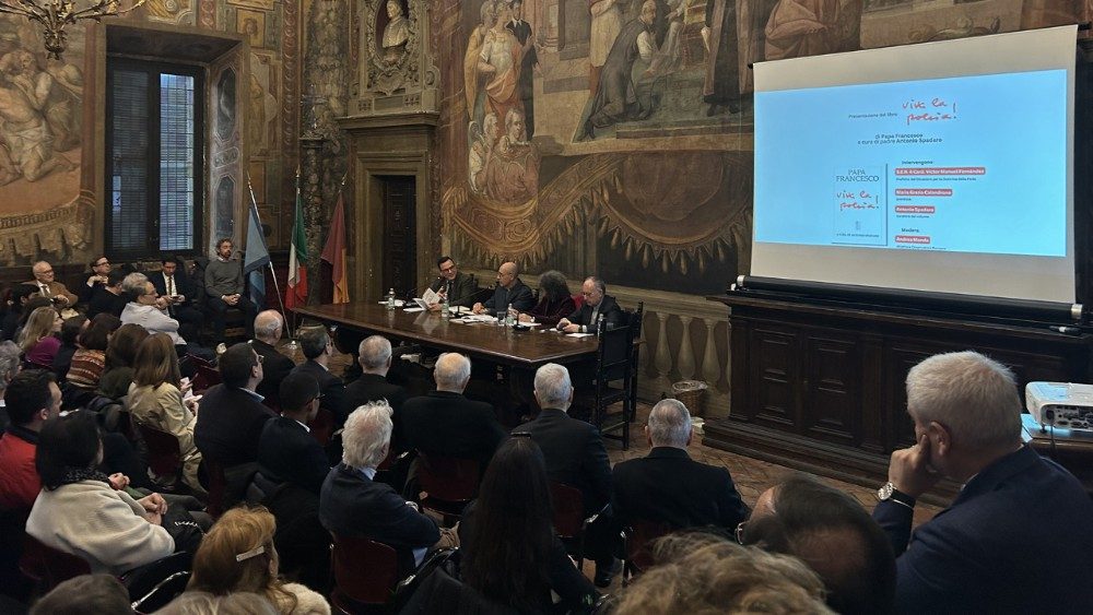 Plateia lotada e muitas pessoas de pé no salão do antigo Hospital Santo Spirito em Roma para o lançamento do livro que é uma coletânea de escritos do Papa Francisco sobre a palavra poética. A coletânea foi apresentada pelo cardeal Víctor Manuel Fernández, prefeito do Dicastério para a Doutrina da Fé, o editor do livro, padre Antonio Spadaro, e a poeta Maria Grazia Calandrone.