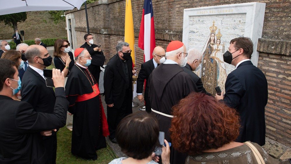 Todo o Chile está representado no mosaico da Virgem do Monte Carmo abençoado e inaugurado na tarde desta quinta-feira (24/06) nos Jardins Vaticanos. As 15.400 peças que compõem o mosaico foram coletadas de todo o território do país sul-americano que reconhece sua Rainha e Padroeira nesta devoção. Os olhos negros de Maria são feitos com obsidiana da Ilha de Páscoa, enquanto o céu ao fundo tem traços sutis de lápis-lazúli. O lado direito do manto da Virgem mostra o mapa, reconstruído com pedras locais, retratando todas as regiões do território nacional, incluindo a Antártida.