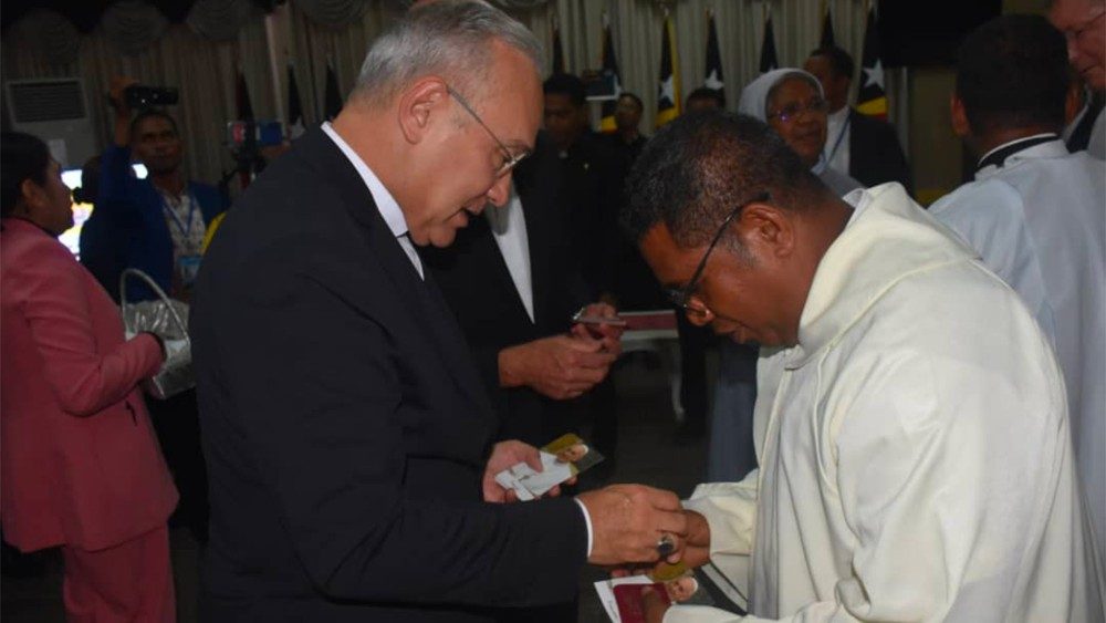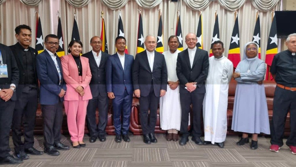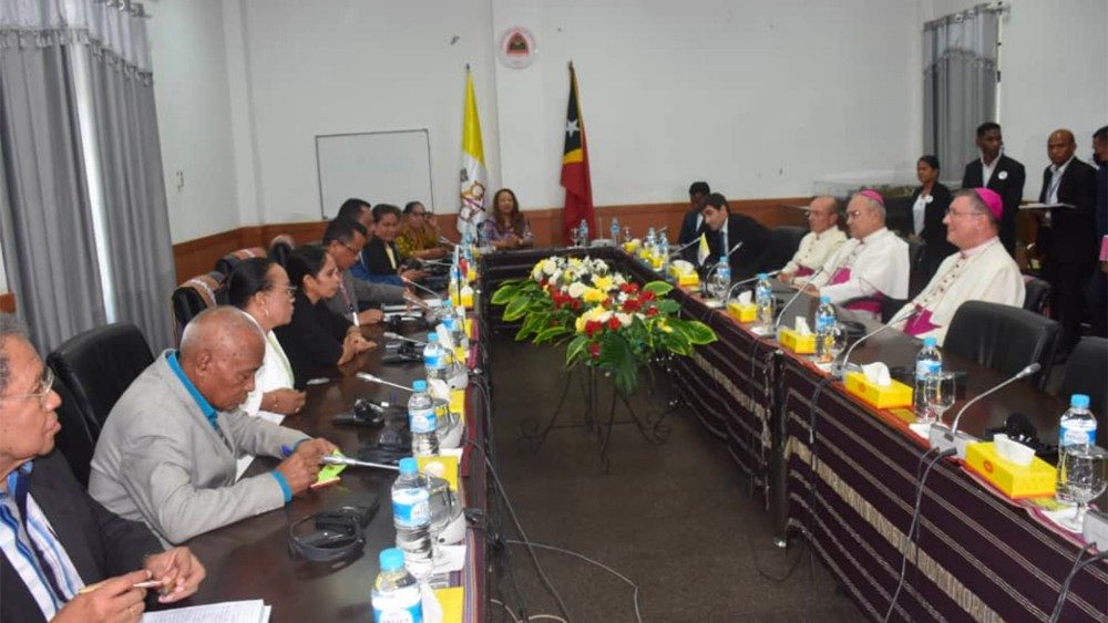 O Arcebispo Edgar Peña Parra, Substituto para os Assuntos Gerais da Secretaria de Estado, concluiu hoje uma visita de cinco dias ao Timor Leste por ocasião da inauguração da nova Nunciatura Apostólica na capital Dili. Antes de sua partida nesta manhã (23), ele se reuniu com o Presidente do Parlamento Nacional Aniceto Guterres, juntamente com representantes de vários partidos. O Arcebispo agradeceu pela acolhida, expressando apreço pelo fato de a assembleia ter aprovado recentemente algumas leis para facilitar a entrada de missionários no país. Os delegados parlamentares, por sua vez, enfatizaram a importância da Igreja na história do país, que junto com as Filipinas é o único estado asiático com maioria católica.