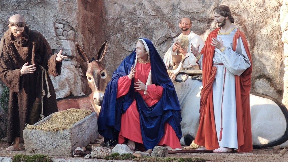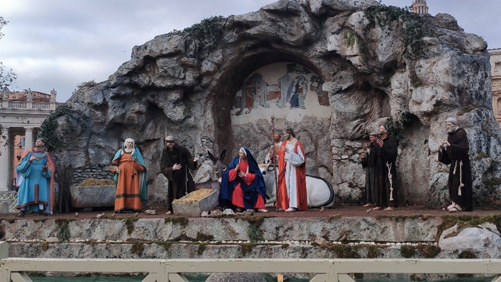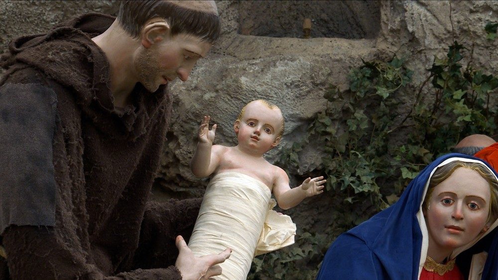 O presépio de São Pedro celebra os 800 anos desta brilhante ideia de São Francisco, desta grande obra de evangelização, como diz o Papa, mas também uma grande obra artística. O seu trabalho foi o de construir um presépio e reconstruí-lo na noite de Natal em Greccio como em Belém. O que ele quis fazer aconteceu precisamente durante as guerras pela Terra Santa. Por isso, quis enviar uma mensagem de paz: reproduzir ali mesmo, em Greccio, naquela terra que o acolheu, a reconstrução teatral de um presépio vivo. Este ano, na Praça São Pedro, se vê um presépio muito particular, onde no centro não estão apenas Maria e José, com o Menino Jesus, mas também São Francisco que segura o Menino nos braços.