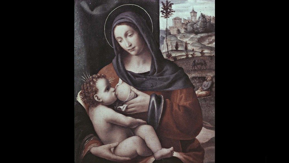 Grandes artistas trabalharam a iconografia da Virgo lactans, que não é simplesmente devocional, mas teológica: mostra que Deus é verdadeiramente aquele Recém-nascido que nas primeiras fases da vida precisa ser nutrido pela mãe, como qualquer outra criança. No Evangelho de Lucas 11,27 há a primeira referência explícita à carnalidade materna de Maria: “Bem-aventurado o ventre que te trouxe e os seios que te amamentaram!”.