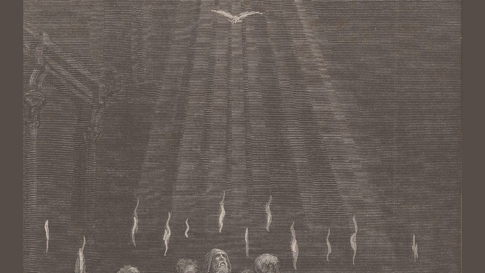 Uma xilogravura extraordinária, preservada entre as gravuras da Biblioteca Apostólica Vaticana, é particularmente significativa. Desenhada pelo célebre Gustave Doré e gravada por Paul Jonnard-Pacel, um de seus colaboradores, ela retrata os Apóstolos e a Virgem Maria. Aqui, Maria é retratada em primeiro plano, à esquerda, e não no centro da cena – como costuma acontecer. Eles estão reunidos no Cenáculo de Jerusalém, lembrado pela arquitetura ao fundo. No alto, paira a pomba, símbolo do Espírito Santo, que faz cair sobre cada um uma chuva de chamas ou línguas de fogo, concedendo-lhes a capacidade de falar diversas línguas.