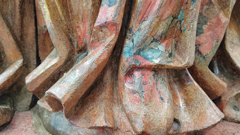 “Há quase trinta anos me ocupo de esculturas de madeira: é uma paixão minha”, explica ela, sem esconder um vínculo especial — profissional, afetivo e espiritual — com a Madonna de Montserrat. “Quando ela chegou aqui em 2011 apresentava problemas de conservação: além de depósitos consistentes de poeira, uma mão havia se desprendido. Então restauramos a estrutura de madeira e limpamos a peça.”