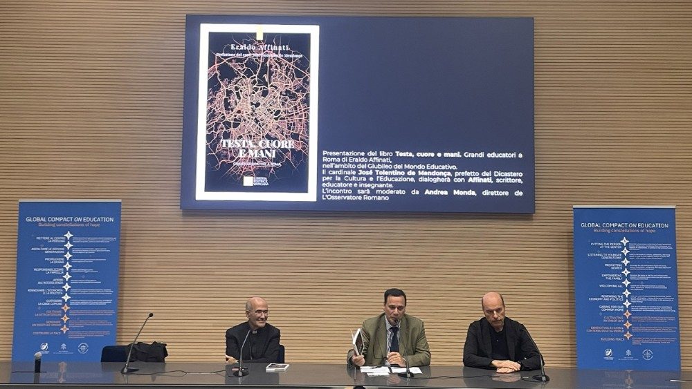 E o amor de Eraldo Affinati, escritor e professor, pela missão educativa aparece em cada página do seu livro, bem como nas palavras da sua intervenção. O cardeal, de quem partiu o pedido para esta guia através das grandes figuras de educadores em Roma — de São Pedro e Paulo, a Santo Agostinho, até Maria Montessori e John Patrick Carrol Abbing, passando por muitos outros — definiu a obra do autor como um "manifesto de esperança". "Uma cidade como Roma pode ser contada do ponto de vista daqueles homens e mulheres que, movidos pela paixão de transmitir aquilo de que o Papa Leão falou hoje — a interioridade, a unidade, o amor e a alegria — se expuseram, se envolveram, para criar formas originais de busca pela verdade, porque educar é buscar juntos a verdade", afirmou o cardeal.